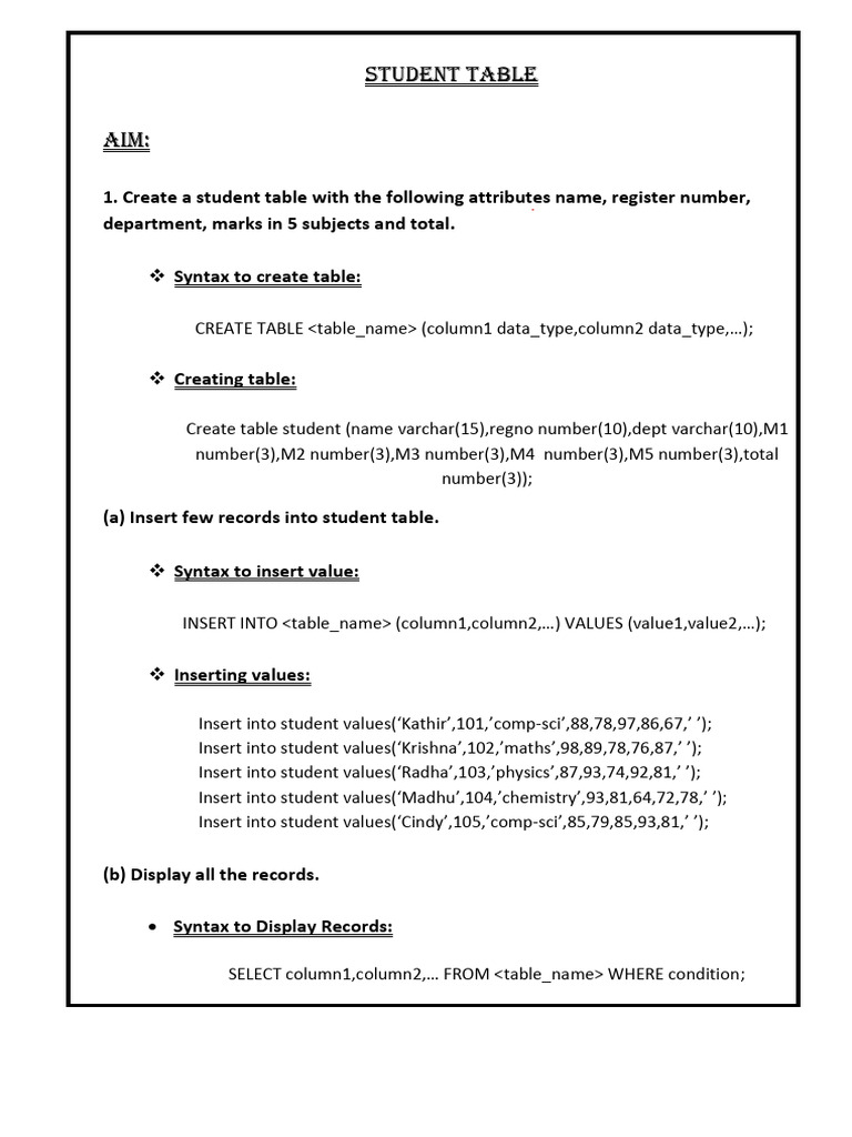 Create table student (name varchar(15),regno number(10),dept varchar(10),M1