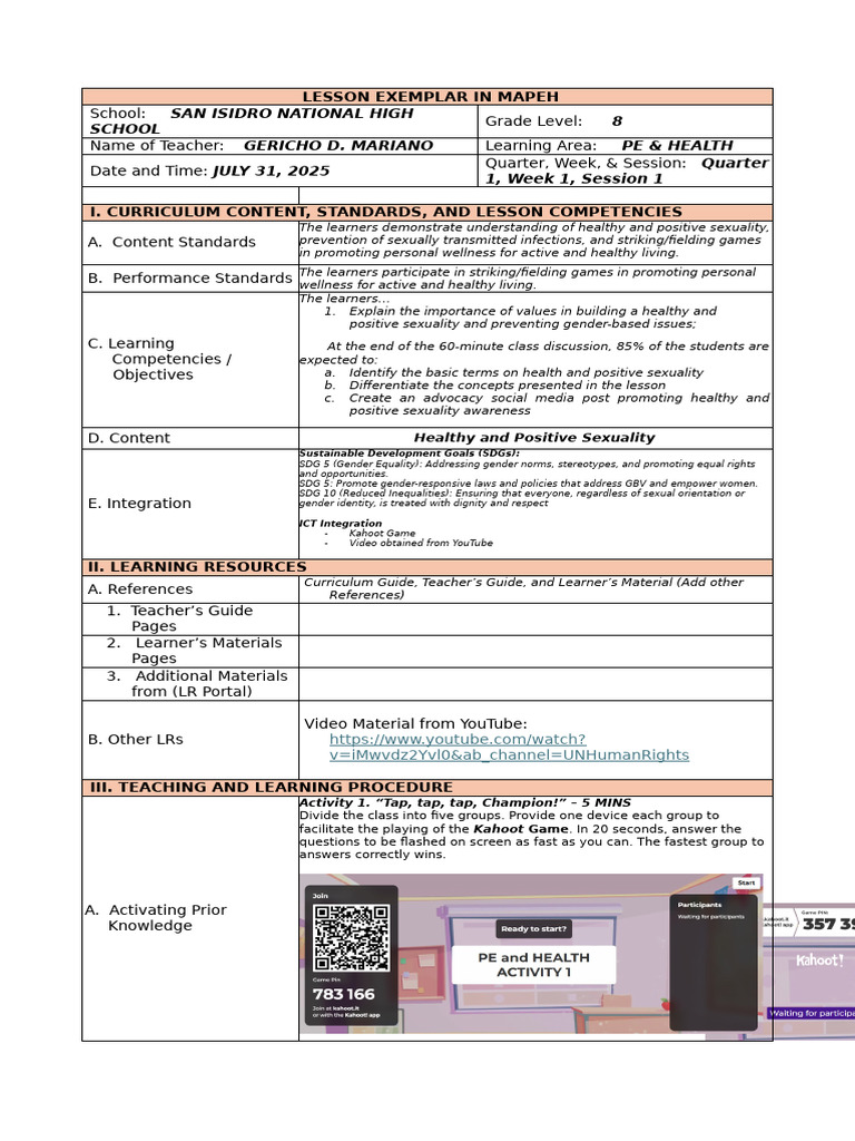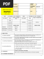 Name of Teacher: GERICHO D. MARIANO Learning Area: PE & HEALTH