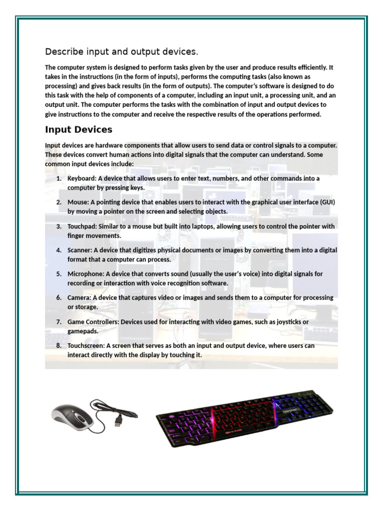 Examples: A keyboard and mouse are examples of input devices, while a monitor and printer
