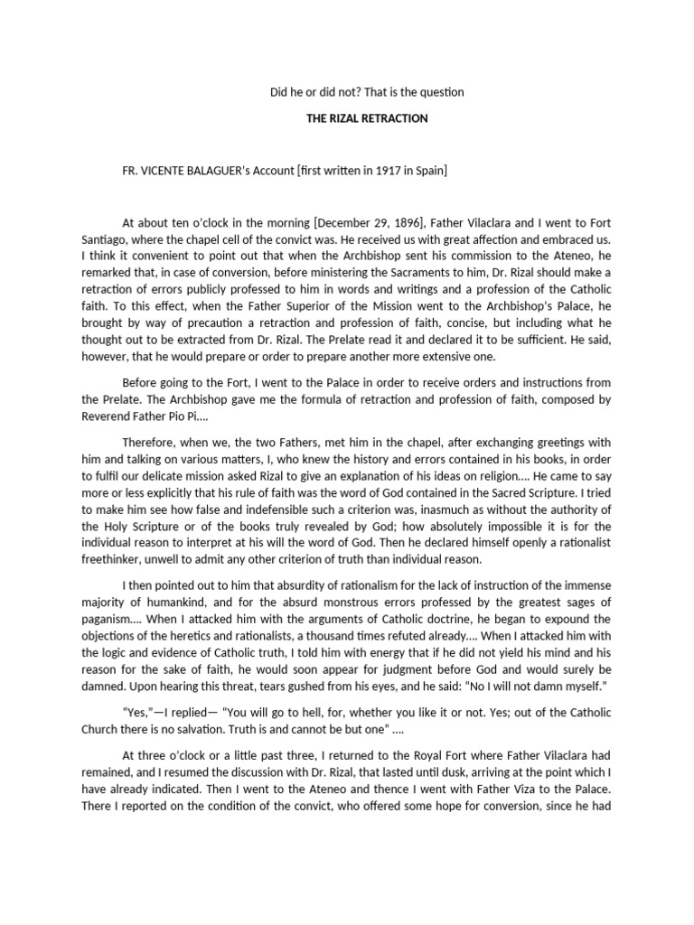 probity believed that Rizal had retracted and died confessed. Had Vilaclara and March, who were with