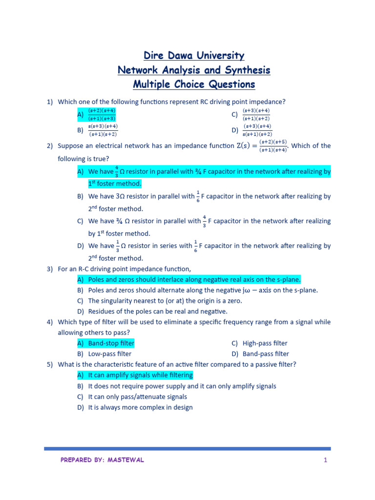 2) Suppose an electrical network has an impedance function Z(s) = (s+1)(s+4). Which of the