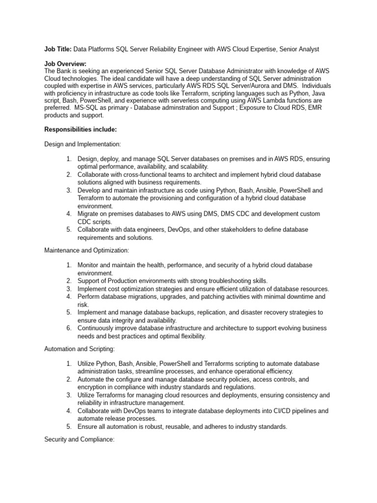The Bank is seeking an experienced Senior SQL Server Database Administrator with knowledge of AWS