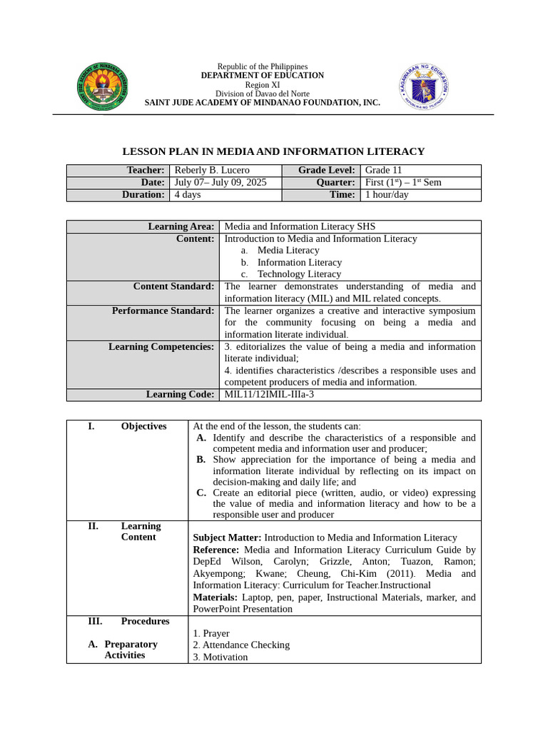 LESSON PLAN IN MEDIA AND INFORMATION LITERACY