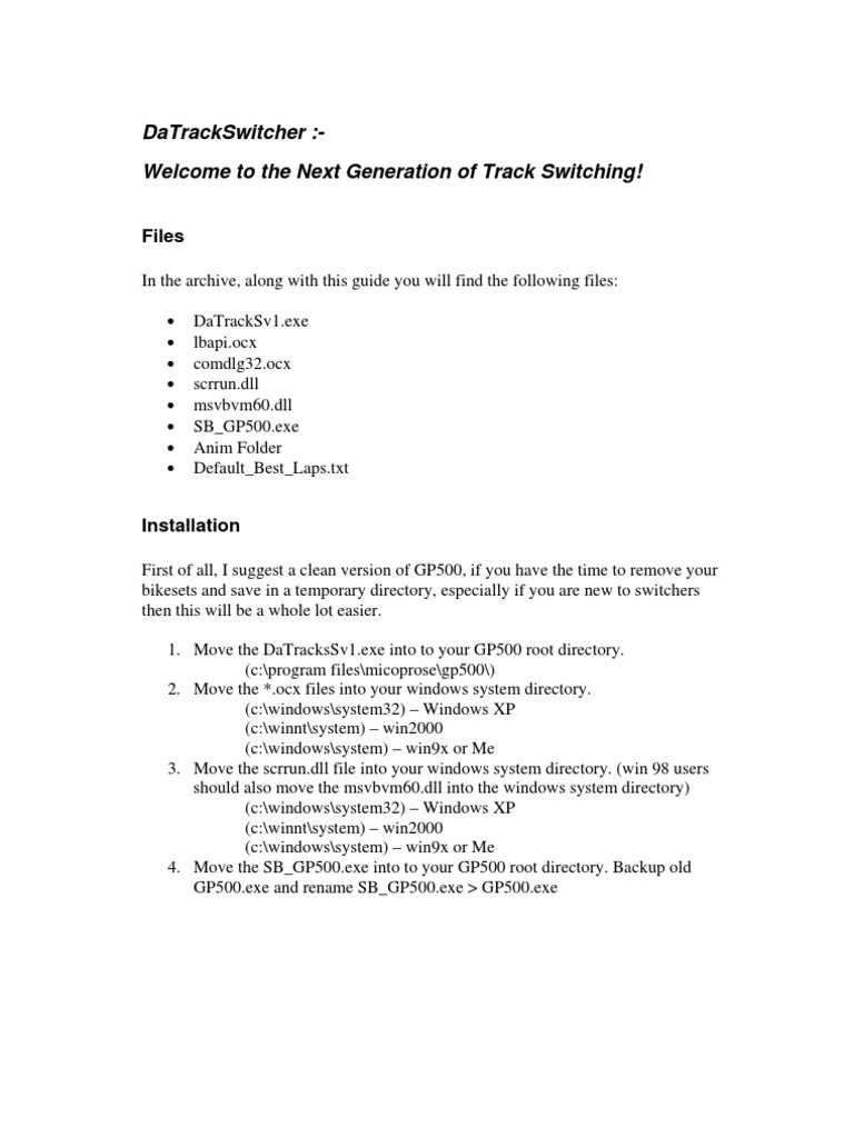 First of all, I suggest a clean version of GP500, if you have the time to remove your bikesets and save in a temporary directory, especially if you are new to switchers then this will be a whole lot easier. 1. Move the DaTracksSv1.exe into to your GP500 root directory. (c:\program files\micoprose\gp500\) 2. Move the *.ocx files into your windows system directory. (c:\windows\system32) Windows XP (c:\winnt\system) win2000 (c:\windows\system) win9x or Me 3. Move the scrrun.dll file into your windows system directory. (win 98 users should also move the msvbvm60.dll into the windows system directory) (c:\windows\system32) Windows XP (c:\winnt\system) win2000 (c:\windows\system) win9x or Me 4. Move the SB_GP500.exe into to your GP500 root directory. Backup old GP500.exe and rename SB_GP500.exe > GP500.exe