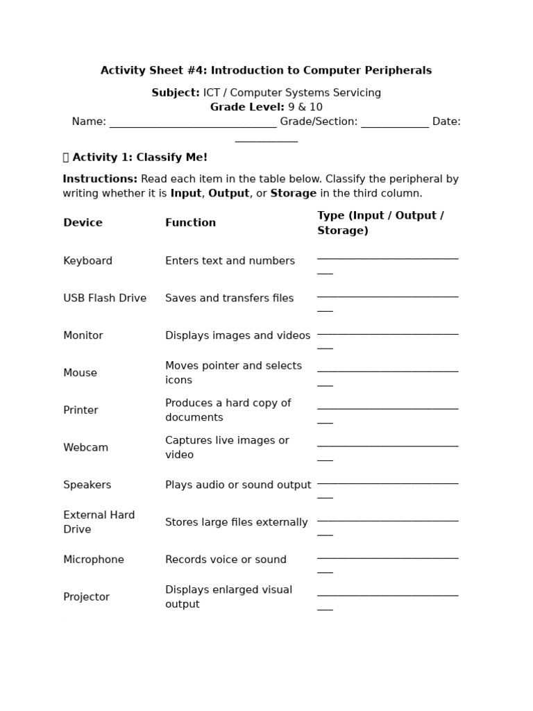 Activity Sheet #4: Introduction to Computer Peripherals