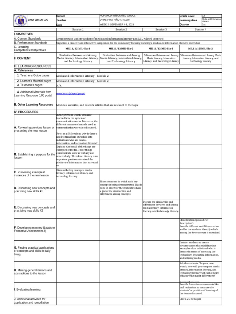DAILY LESSON LOG Teacher CYRALV VAN NIÑO P. NABOR Learning Area Literacy