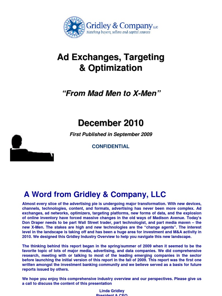 Almost every slice of the advertising pie is undergoing major transformation. With new devices, channels, technologies, content, and formats, advertising has never been more complex. Ad exchanges, ad networks, optimizers, targeting platforms, new forms of data, and the explosion of online inventory have forced massive changes in the old ways of Madison Avenue. Todays Don Draper needs to be part Wall Street trader, part technologist, and part media maven the new X-Men. The stakes are high and new technologies are the change agents. The interest level in the landscape is taking off and has been a huge area for investment and M&A activity in 2010. We designed this Gridley Industry Overview to help you navigate this new landscape. The thinking behind this report began in the spring/summer of 2009 when it seemed to be the favorite topic of lots of major media, advertising, and data companies. We did comprehensive research, meeting with or talking to most of the leading emerging companies in the sector before launching the initial version of this report in the fall of 2009. This report was the first one written amongst the investment banking community and we believe served as a basis for future reports issued by others. We hope you enjoy this comprehensive industry overview and our perspectives. Please give us a call to discuss the content of this presentation Linda Gridley President & CEO linda.gridley@gridleyco.com 212-400-9710