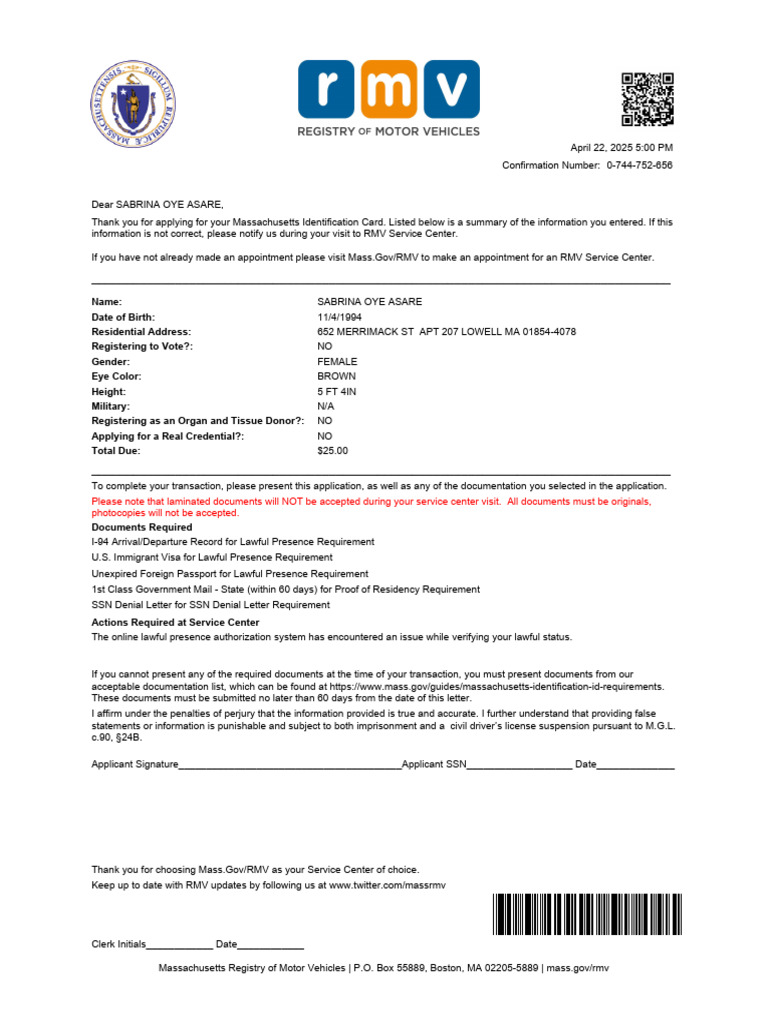 Thank you for applying for your Massachusetts Identification Card. Listed below is a summary of the information you entered. If this