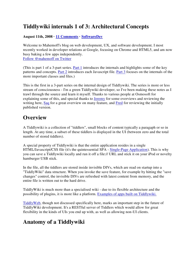 August 11th, 2008 11 Comments SoftwareDev Welcome to Mahemoff's blog on web development, UX, and software development. I most recently worked in developer relations at Google, focusing on Chrome and HTML5, and am now busy baking a few apps independently. Follow @mahemoff on Twitter (This is part 1 of a 3-part series. Part 1 introduces the internals and highlights some of the key patterns and concepts. Part 2 introduces each Javascript file. Part 3 focuses on the internals of the more important classes and files.) This is the first in a 3-part series on the internal design of Tiddlywiki. The series is more or less stream of consciousness - I'm a green Tiddlywiki developer, so I've been making these notes as I trawl through the source and learn it myself. Thanks to various people at Osmosoft for explaining some of this, and special thanks to Jeremy for some overviews and reviewing the writing here, Saq for a great overview on many feature, and Fred for reviewing the initially published version.