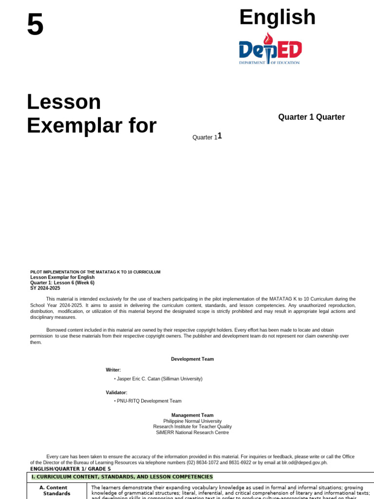 This material is intended exclusively for the use of teachers participating in the pilot implementation of the MATATAG K to 10 Curriculum during the