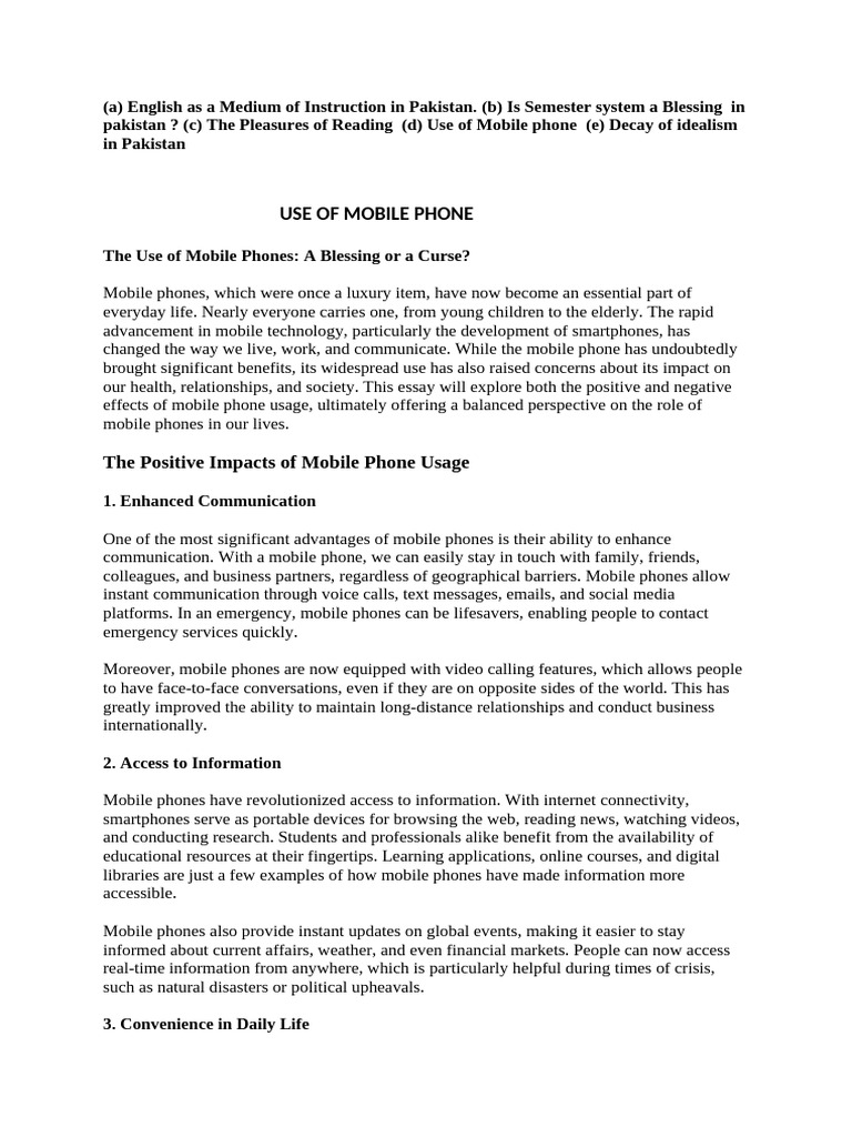 pakistan ? (c) The Pleasures of Reading (d) Use of Mobile phone (e) Decay of idealism