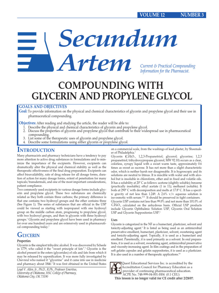 Goal: To provide information on the physical and chemical characteristics of glycerin and propylene glycol and their use in