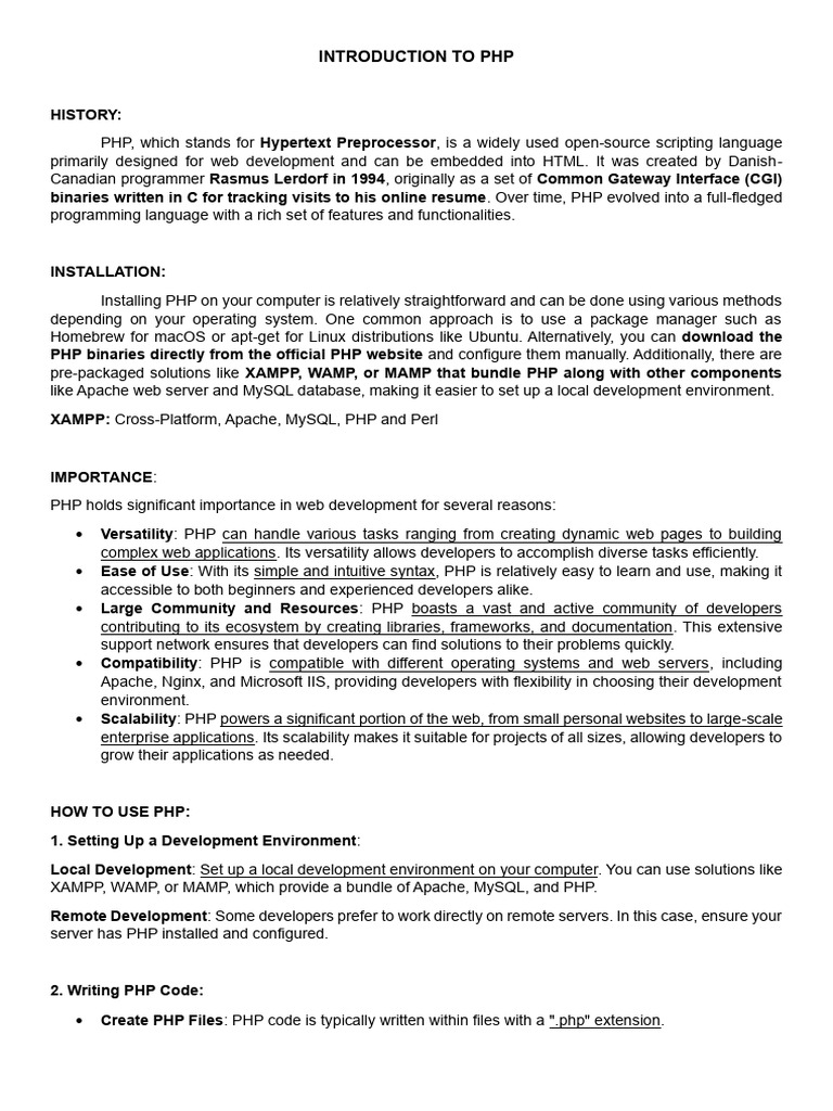 • Embedding PHP: PHP code can be embedded directly into HTML files using opening and closing
