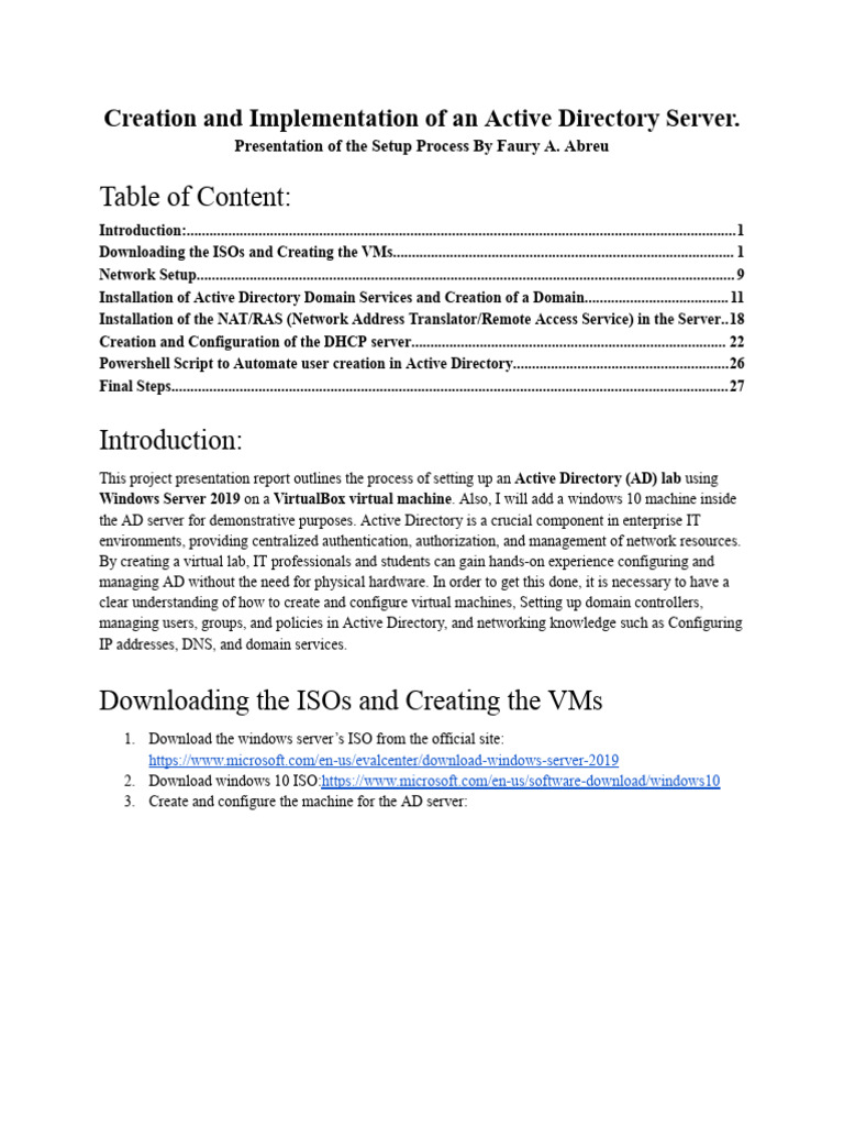 This project presentation report outlines the process of setting up an Active Directory (AD) lab using