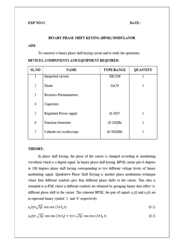 1. The BPSK modulator circuit is constructed as per the circuit diagram shown in Figure .1