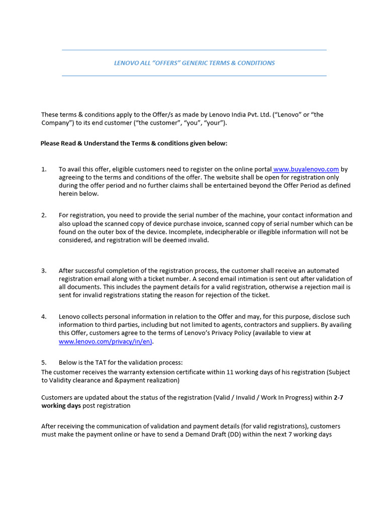 Lenovo All "Offers" Generic Terms & Conditions: Please Read & Understand The Terms & Conditions Given Below