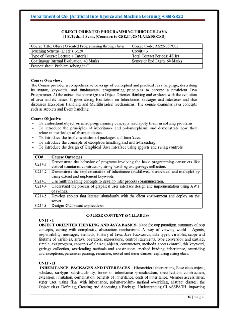 The document outlines a course on Object Oriented Programming through Java for B.Tech students, detailing its objectives, teaching scheme, and evaluation methods. It covers essential Java concepts including inheritance, exception handling, multithreading, and GUI design using applets and swing controls. The syllabus is divided into five units, each focusing on different aspects of Java programming and includes recommended textbooks and reference materials.