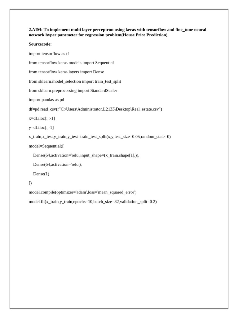 AIM: To implement multi layer perceptron using keras with tensorflow and fine_tune neural
