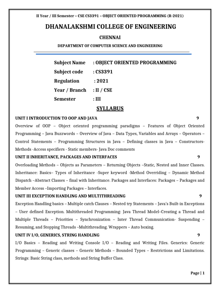 II Year / III Semester – CSE CS3391 – OBJECT ORIENTED PROGRAMMING (R-2021)