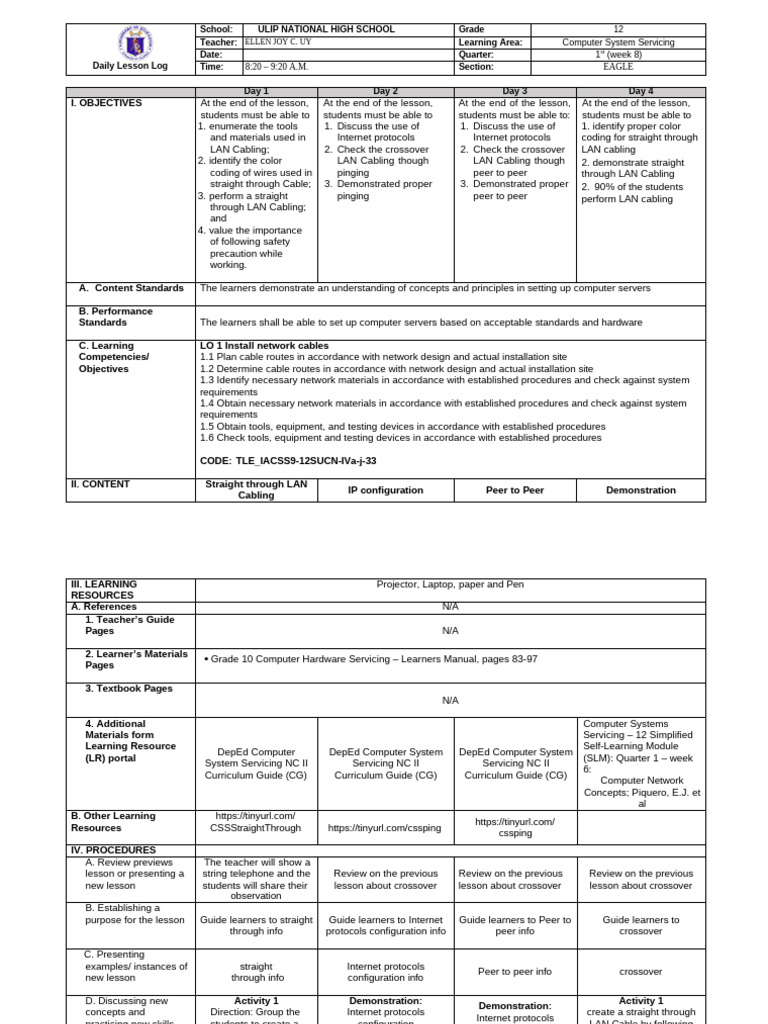 Teacher: ELLEN JOY C. UY Learning Area: Computer System Servicing
