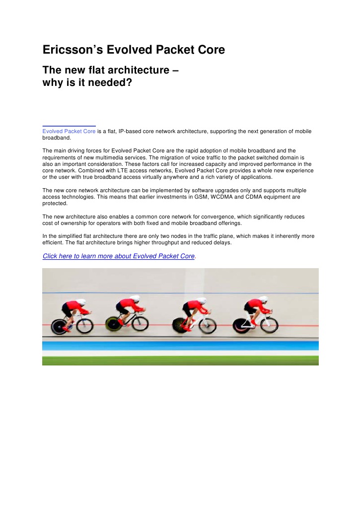 Evolved Packet Core is a flat, IP-based core network architecture, supporting the next generation of mobile broadband. The main driving forces for Evolved Packet Core are the rapid adoption of mobile broadband and the requirements of new multimedia services. The migration of voice traffic to the packet switched domain is also an important consideration. These factors call for increased capacity and improved performance in the core network. Combined with LTE access networks, Evolved Packet Core provides a whole new experience or the user with true broadband access virtually anywhere and a rich variety of applications. The new core network architecture can be implemented by software upgrades only and supports multiple access technologies. This means that earlier investments in GSM, WCDMA and CDMA equipment are protected. The new architecture also enables a common core network for convergence, which significantly reduces cost of ownership for operators with both fixed and mobile broadband offerings. In the simplified flat architecture there are only two nodes in the traffic plane, which makes it inherently more efficient. The flat architecture brings higher throughput and reduced delays.