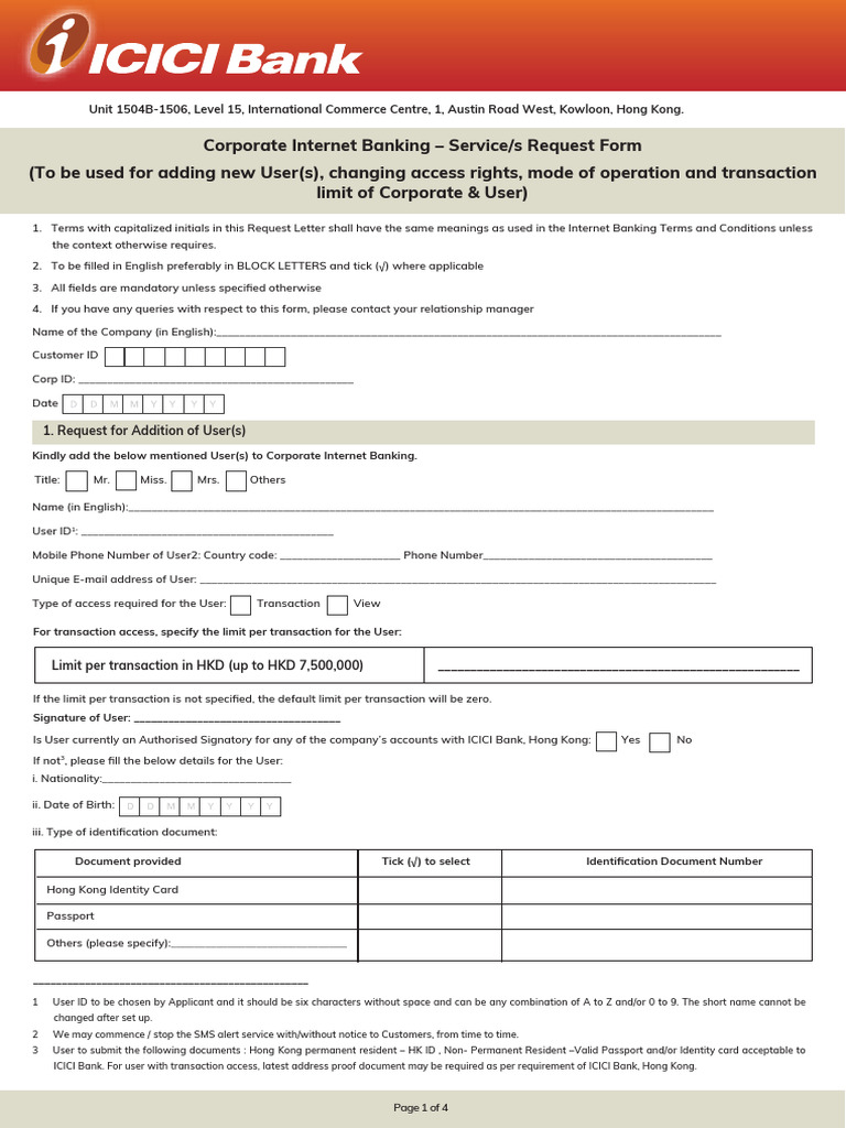 ICICI Bank. For user with transaction access, latest address proof document may be required as per requirement of ICICI Bank, Hong Kong.