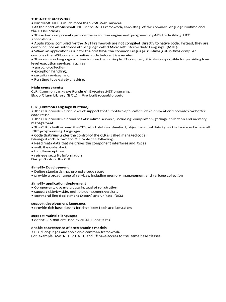• The CLR provides a broad set of runtime services, including compilation, garbage collection and memory