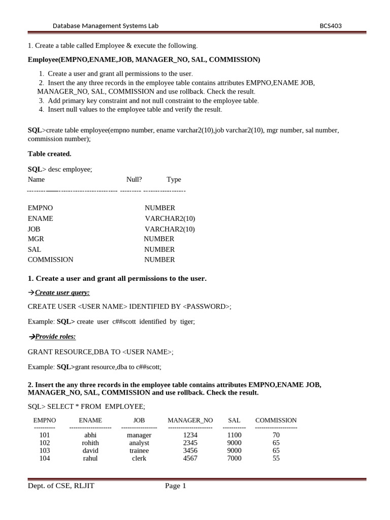 2. Create a table called Employee that contain attributes EMPNO,ENAME, JOB, MGR,SAL & execute the