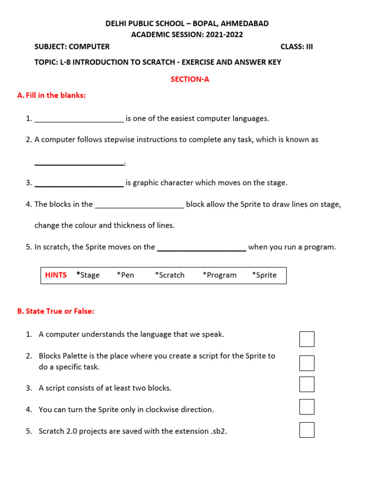 TOPIC: L-8 INTRODUCTION TO SCRATCH - EXERCISE AND ANSWER KEY