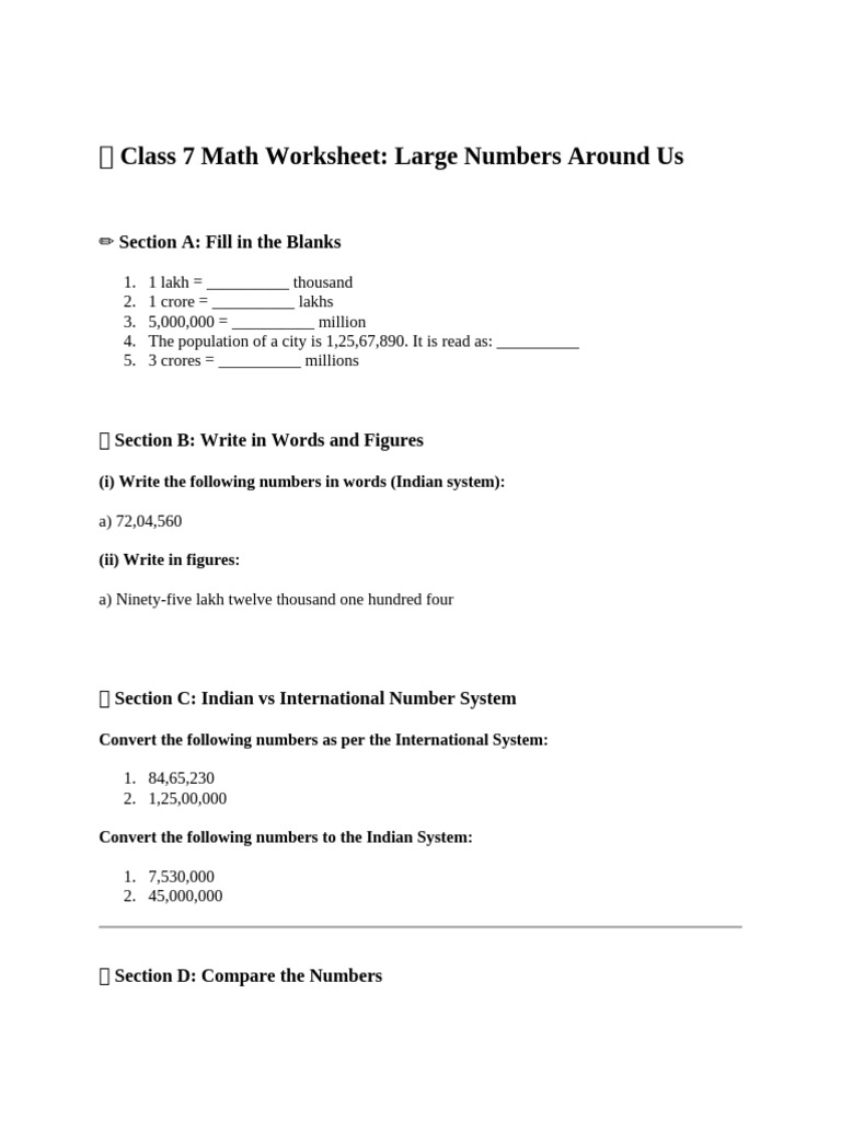 📝 Class 7 Math Worksheet: Large Numbers Around Us