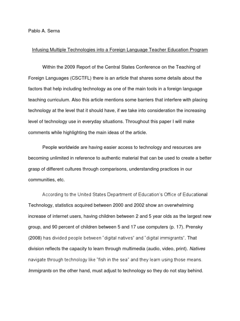 Within the 2009 Report of the Central States Conference on the Teaching of Foreign Languages (CSCTFL) there is an article that shares some details about the factors that help including technology as one of the main tools in a foreign language teaching curriculum. Also this article mentions some barriers that interfere with placing technology at the level that it should have, if we take into consideration the increasing level of technology use in everyday situations. Throughout this paper I will make comments while highlighting the main ideas of the article. People worldwide are having easier access to technology and resources are becoming unlimited in reference to authentic material that can be used to create a better grasp of different cultures through comparisons, understanding practices in our communities, etc. According to the United States Department of Educations Office of Educational Technology, statistics acquired between 2000 and 2002 show an overwhelming increase of internet users, having children between 2 and 5 year olds as the largest new group, and 90 percent of children between 5 and 17 use computers (p. 17). Prensky (2008) has divided people between digital natives and digital immigrants. That division reflects the capacity to learn through multimedia (audio, video, print). Natives navigate through technology like fish in the sea and they learn using those means. Immigrants on the other hand, must adjust to technology so they do not stay behind.