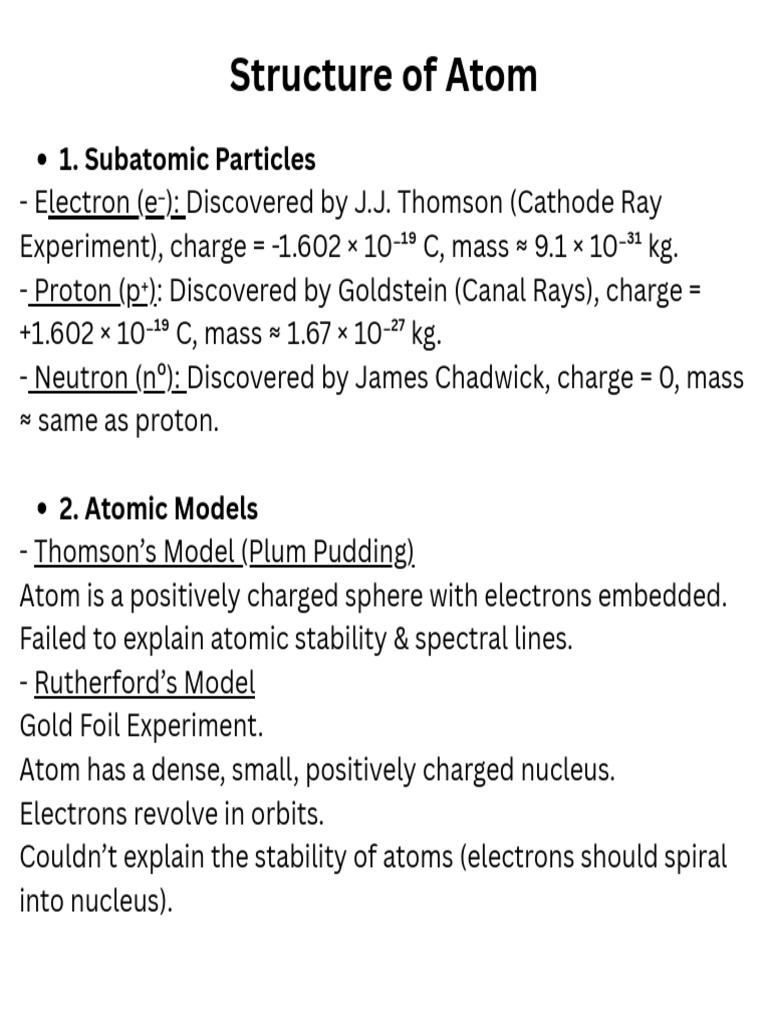 - Proton (p⁺): Discovered by Goldstein (Canal Rays), charge =
