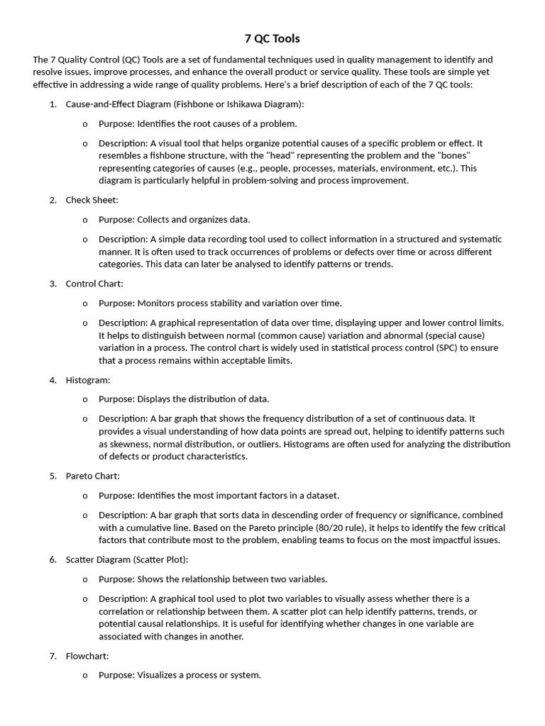 effective in addressing a wide range of quality problems. Here's a brief description of each of the 7 QC tools: