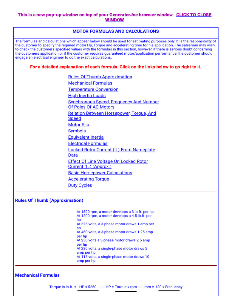 Motor Formulas and Calculations, Index of Helpful Tools