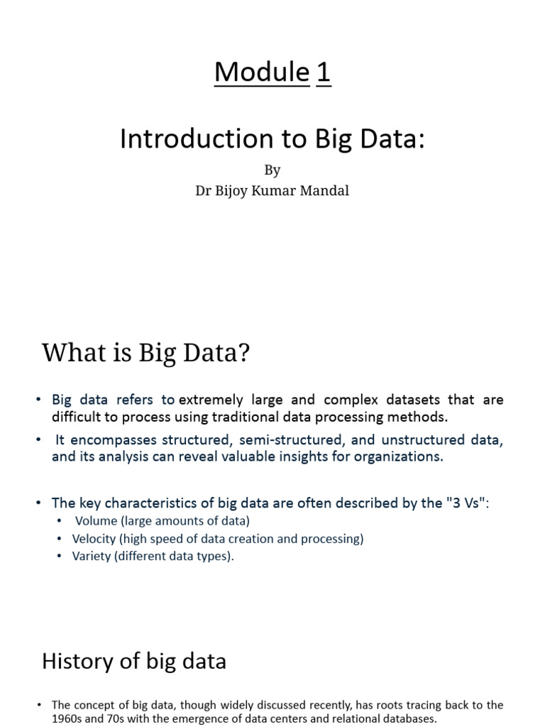 • Big data is characterized by five key elements, often referred to as the "5 V's": Volume, Velocity,
