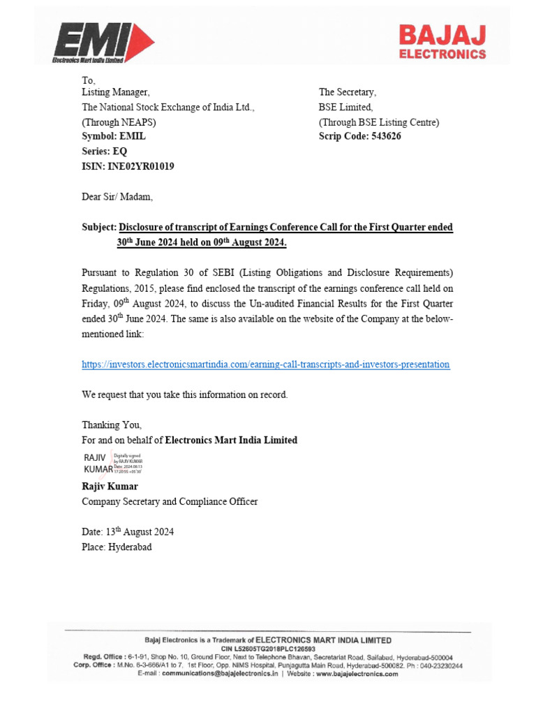 Moderator: Ladies and gentlemen, good day and welcome to Electronics Mart India Limited Q1 FY25