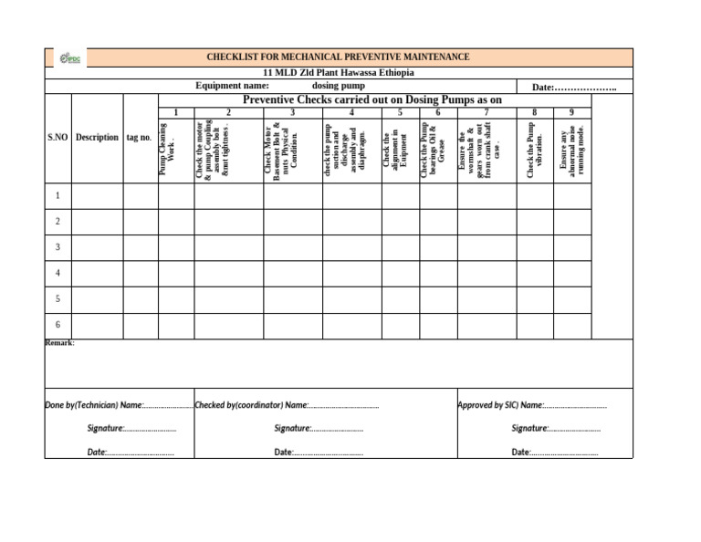 Done by(Technician) Name:……………………..Checked by(coordinator) Name:……………………………. Approved by SIC) Name:……………………...…