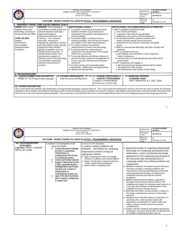 OUTCOME - BASED COURSE SYLLABUS IN (ICT115 – PROGRAMMING LANGUAGES) Effective