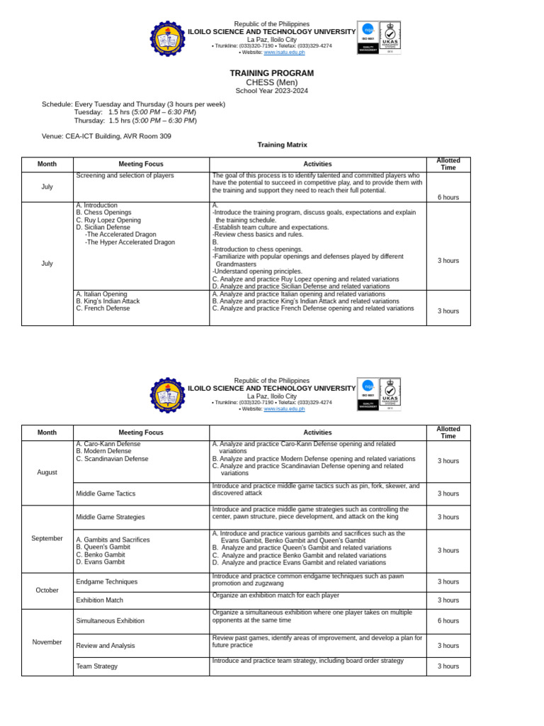 Schedule: Every Tuesday and Thursday (3 hours per week)
