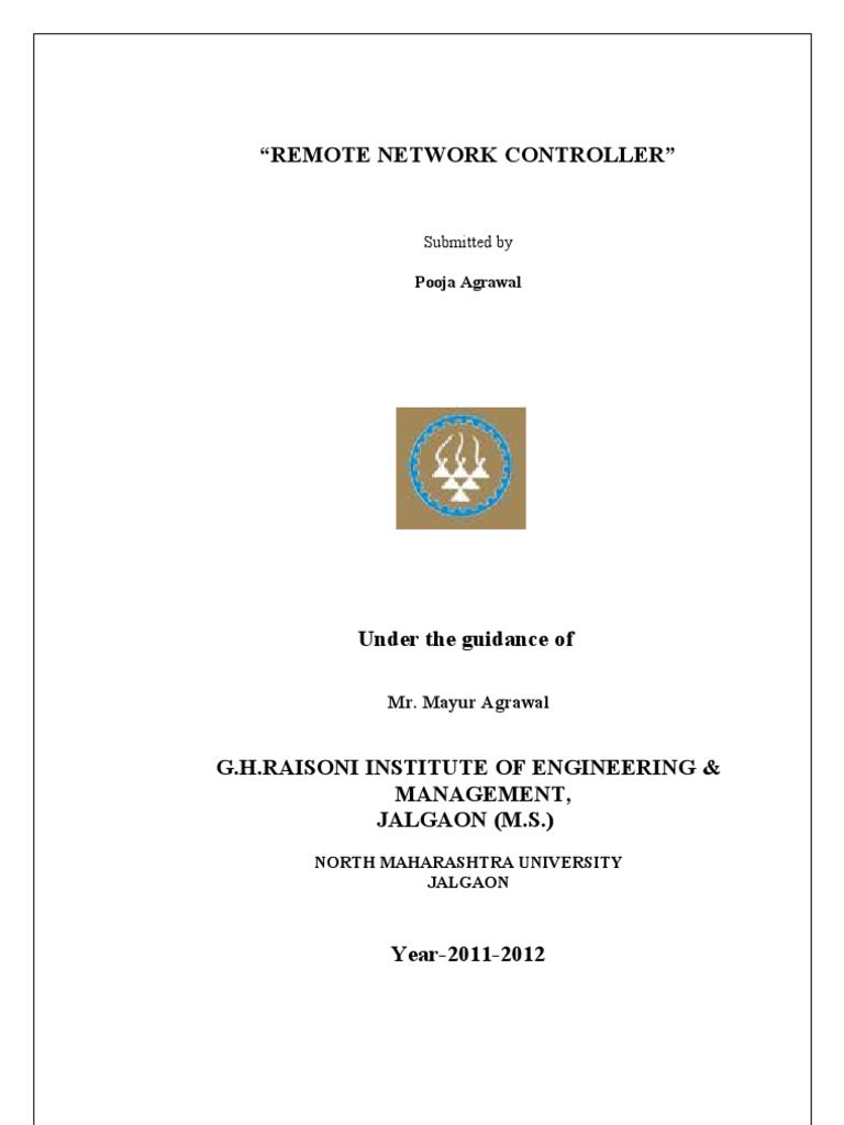 Department of Computer science CERTIFICATE This is to certify that the project report entitled Remote Network Controller being submitted by Mr. /Mrs Pooja Shrikant Agrawal in partial fulfillment for the award of the Degree of Bachelor of Technology in CS to the North Maharashtra University, Jalgaon is a record of bonafied work carried out by him under my guidance and supervision. The results embodied in this project report have not been submitted to any other University or Institute for the award of any Degree or Diploma.