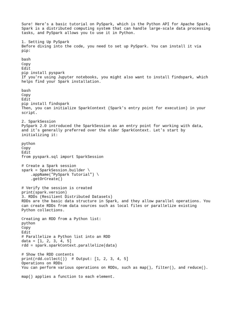 Sure! Here's a basic tutorial on PySpark, which is the Python API for Apache Spark.