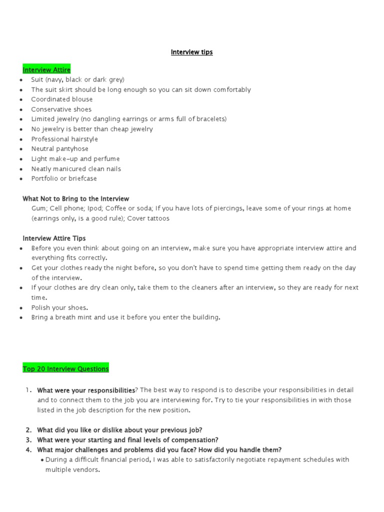 Top 20 Interview Questions 1. What were your responsibilities? The best way to respond is to describe your responsibilities in detail and to connect them to the job you are interviewing for. Try to tie your responsibilities in with those listed in the job description for the new position. 2. What did you like or dislike about your previous job? 3. What were your starting and final levels of compensation? 4. What major challenges and problems did you face? How did you handle them? During a difficult financial period, I was able to satisfactorily negotiate repayment schedules with multiple vendors.