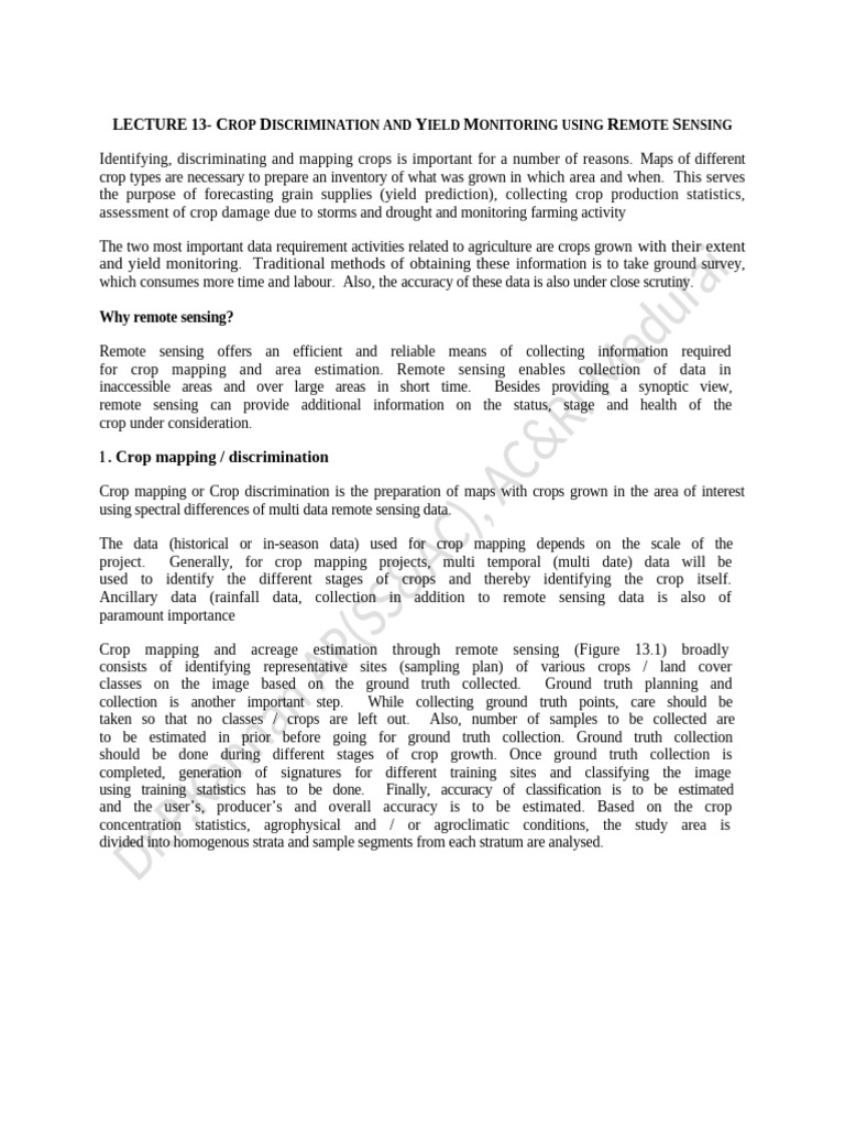 LECTURE 13- CROP DISCRIMINATION AND YIELD MONITORING USING REMOTE SENSING