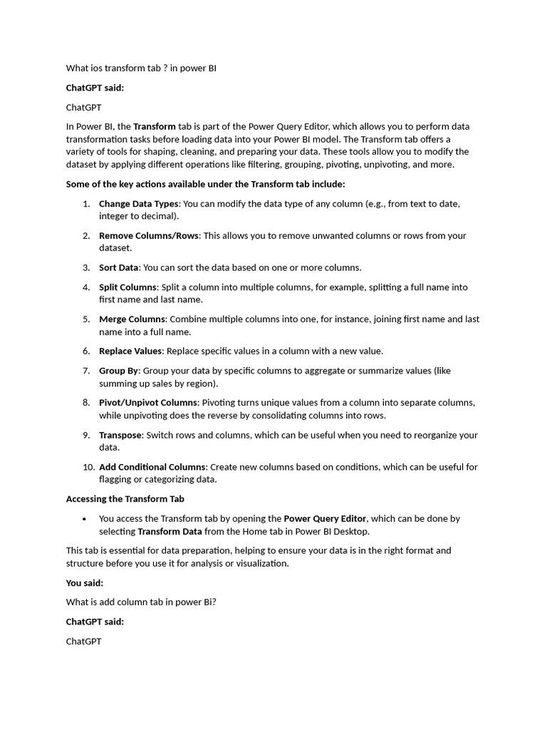 transformation tasks before loading data into your Power BI model. The Transform tab offers a