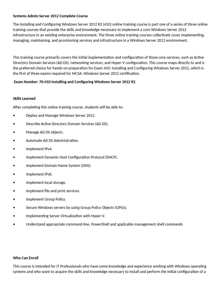 Directory Domain Services (AD DS), networking services, and Hyper-V configuration. This course maps directly to and is