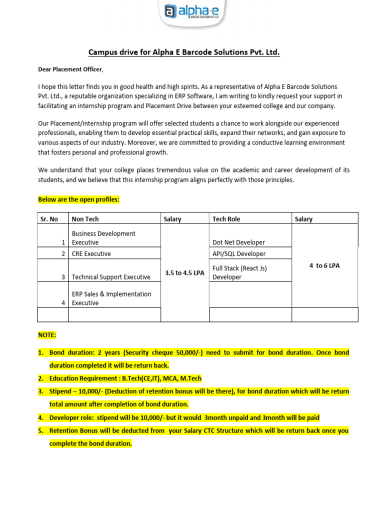 Campus drive for Alpha E Barcode Solutions Pvt. Ltd.