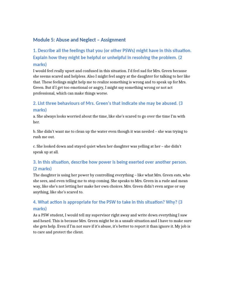 1. Describe all the feelings that you (or other PSWs) might have in this situation.