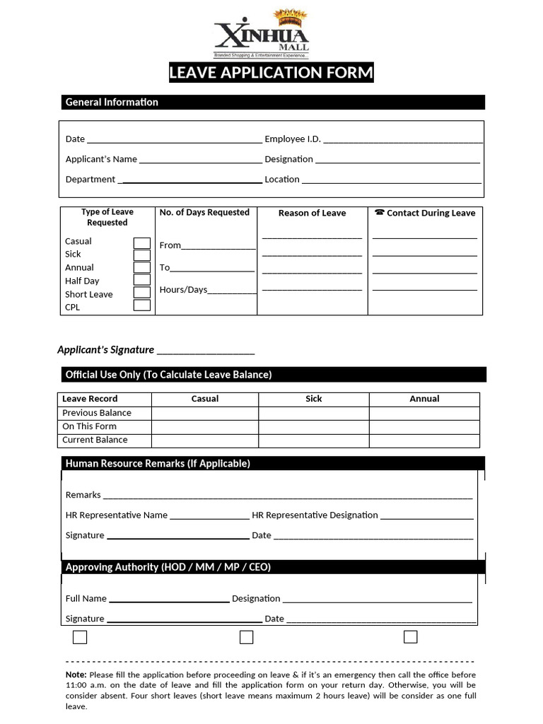 Note: Please fill the application before proceeding on leave & if it’s an emergency then call the office before