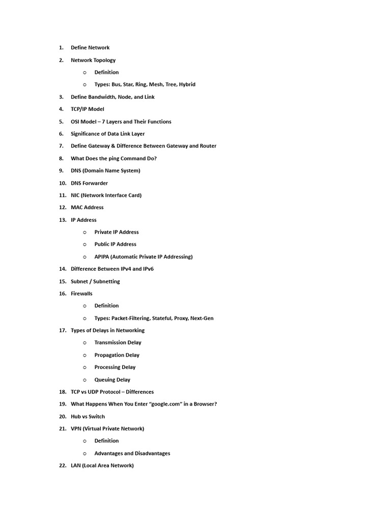 o Types: Bus, Star, Ring, Mesh, Tree, Hybrid