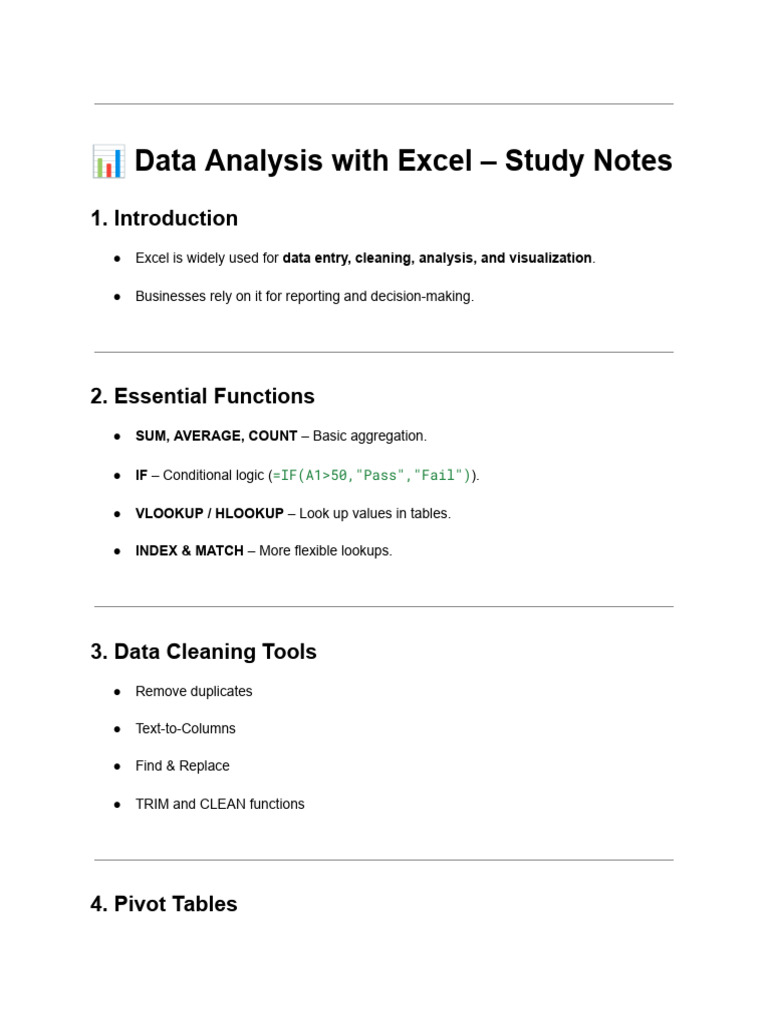 ● IF – Conditional logic (=IF(A1>50,"Pass","Fail")).